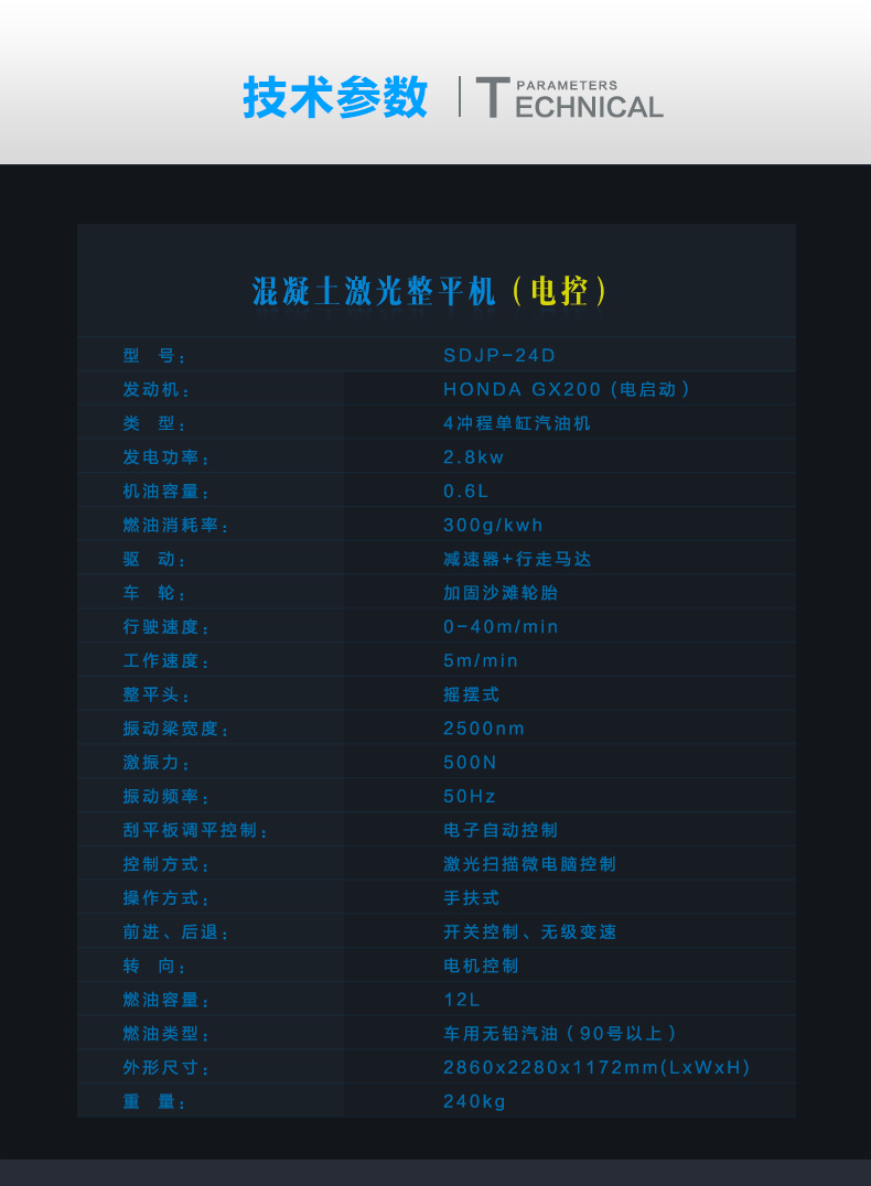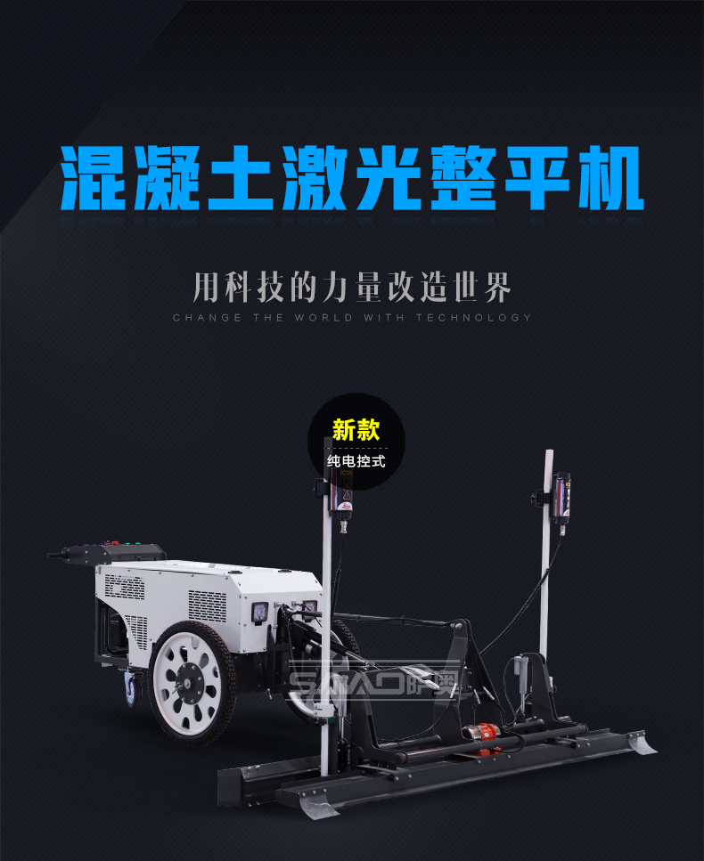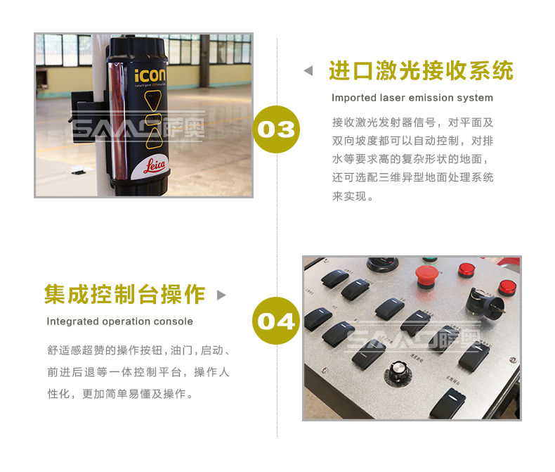 手扶式電控激光整平機(jī)是原裝進(jìn)口激光發(fā)射接收系統(tǒng),兩種輪胎可選,本田汽油動(dòng)力,控制面板多樣化。