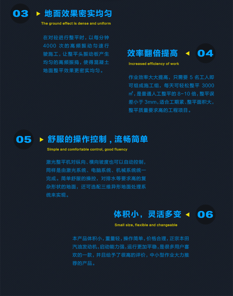 2.精密激光整平機(jī)的整平原理是,依靠液力驅(qū)動(dòng)的整平頭,配合激光系統(tǒng)和電腦控制系統(tǒng)在自動(dòng)找平的同時(shí)完成整平工作。整平頭上配備有一體化設(shè)計(jì)的刮板、振動(dòng)器和整平板,將所有找平、整平、振搗壓實(shí)工作集于一身,并一次性完成。電腦控制系統(tǒng)每秒10次實(shí)時(shí)自動(dòng)調(diào)整標(biāo)高,均衡設(shè)計(jì)的振動(dòng)器振動(dòng)頻率達(dá)4000次/分鐘。