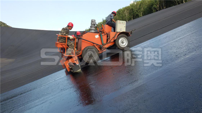 瀝青封閉層的施工采用適合于斜坡施工的專用瀝青瑪蹄脂涂刷機,在牽引臺車的牽引下沿著面板從下往上涂刷。涂刷完一個條帶后,將涂刷機移動至下一個條帶繼續(xù)涂刷?,斕阒忾]層涂刷作業(yè)時環(huán)境氣溫應(yīng)在10℃以上,涂刷溫度一般在170℃~190℃;施工完成的封閉層表面禁止無關(guān)人員和機械行走;特殊部位:壩頂及曲率半徑較小的圓弧斷,采用小型機械涂刷方式進行機械涂刷進行,環(huán)庫水平段及弧段全部采用小刮涂機配合人工進行刮涂施工。