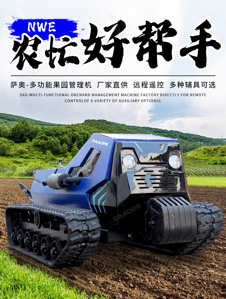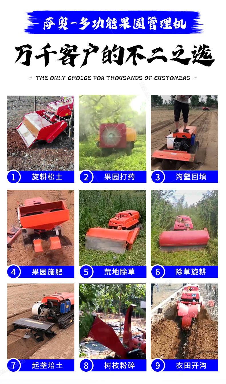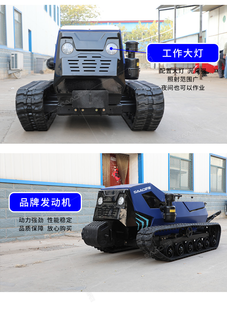 本產(chǎn)品采用履帶式驅(qū)動(dòng)設(shè)計(jì),穩(wěn)定性和爬坡能力較強(qiáng),適應(yīng)丘陵山地平原各種地形,機(jī)型小功率大,適應(yīng)各種行距的果樹,大棚,園林。產(chǎn)品動(dòng)力強(qiáng)勁,結(jié)實(shí)耐用,性能優(yōu)越,安全放心,遠(yuǎn)程操控,省心省力。
