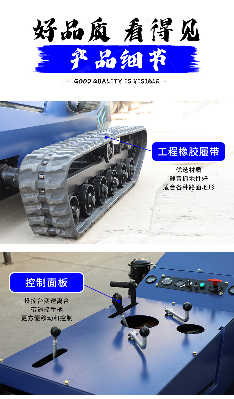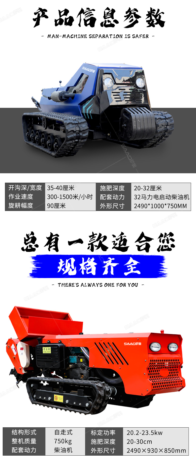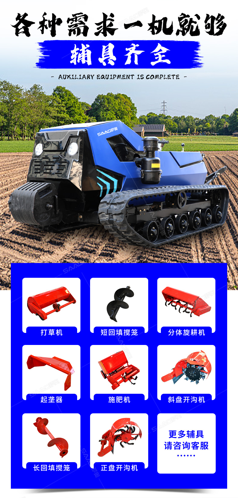 本產(chǎn)品采用履帶式驅(qū)動(dòng)設(shè)計(jì),穩(wěn)定性和爬坡能力較強(qiáng),適應(yīng)丘陵山地平原各種地形,機(jī)型小功率大,適應(yīng)各種行距的果樹,大棚,園林。產(chǎn)品動(dòng)力強(qiáng)勁,結(jié)實(shí)耐用,性能優(yōu)越,安全放心,遠(yuǎn)程操控,省心省力。