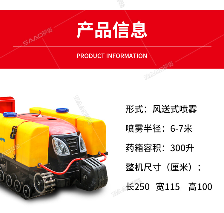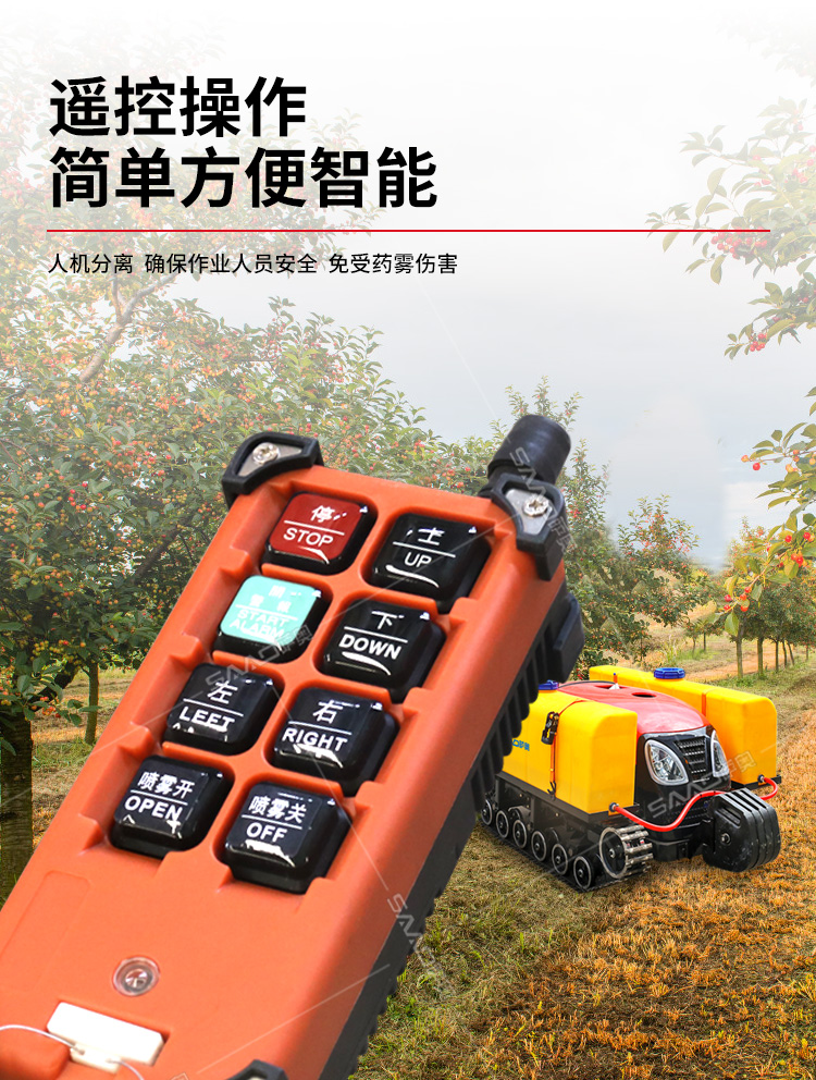 28馬力鋼履帶自行式打藥機(jī),風(fēng)送式噴霧機(jī),霧化好,噴射距離遠(yuǎn);遙控操作,人機(jī)分離,確保作業(yè)人員安全,免受藥?kù)F傷害。