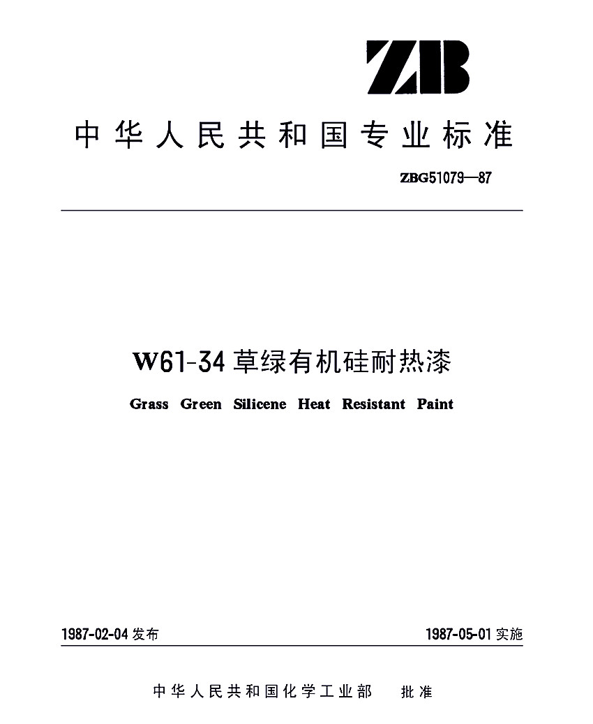 HG/T 3361-1987 W61-34草綠有機硅耐熱漆標準ZBG51079-87(代替HG 2-637-74) ZB 中華人民共和國專業標準 ZBG51079-87 W61-34草綠有機硅耐熱漆Grass Green Silicene Heat Resistant Paint 1987-02-04發布,1987-05-01實施 中華人民共和國化學工業部 批準 ZBG51079-87代替HG 2