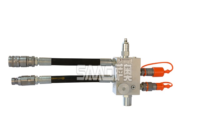 液壓分流閥用于連接液壓工具和一挖掘機、裝載機、工程車等承載設(shè)備的液壓動力輸出端。